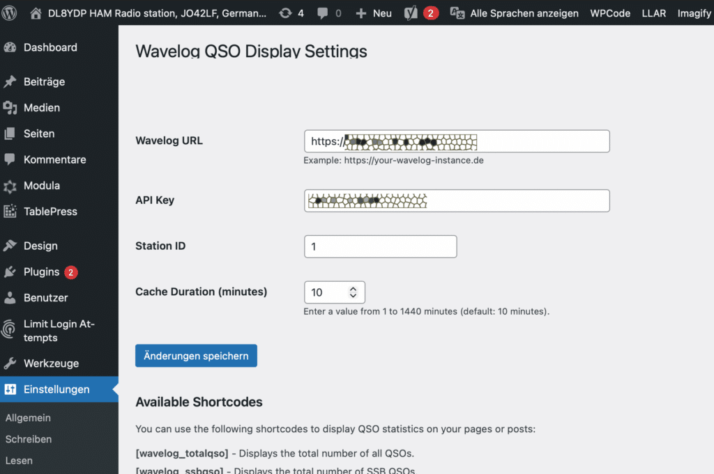 I created a WordPress plugin, that retrieves Wavelog data via API and displays the QSO numbers per operating mode via shortcodes in WordPress. The Wavelog URL, the API key and the station ID can be configured in the admin area of WordPress.